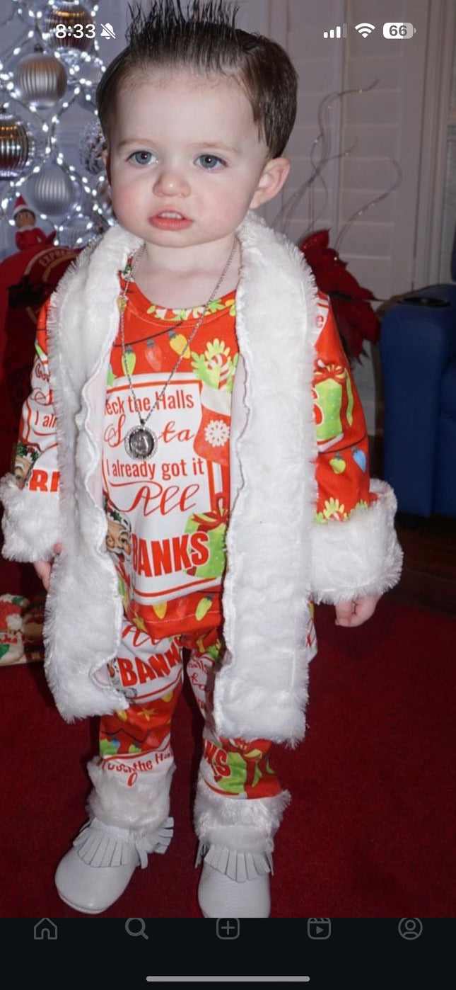 Christmas- long sleeve pant set and robe. House shoes. Trimmed in white fur like pic